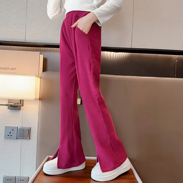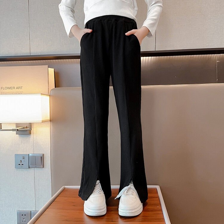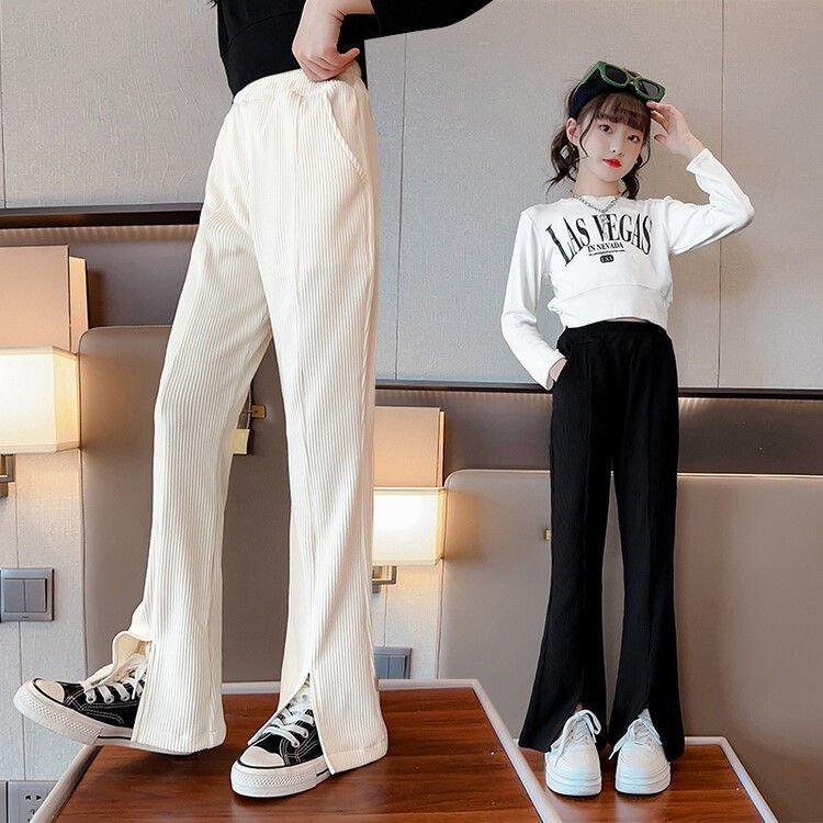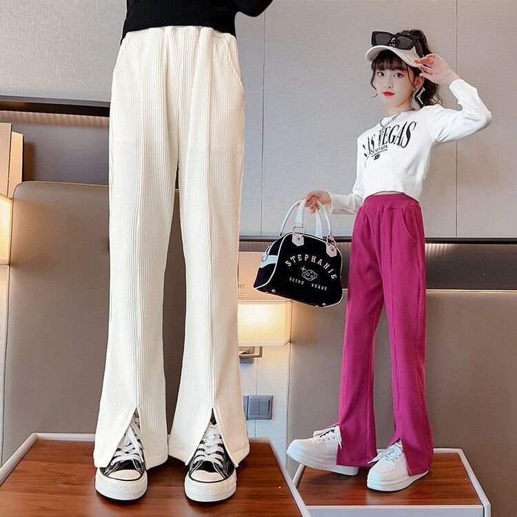 Брюки имеют широкие штанины с разрезами, что делает их стильными и модными. Они представлены в трех прекрасных цветах: черном, кремовом и ярком цвете питахайи. Также, вы можете выбрать подходящий размер для вашей девочки, так как они доступны для роста от 120 см до 170 см.