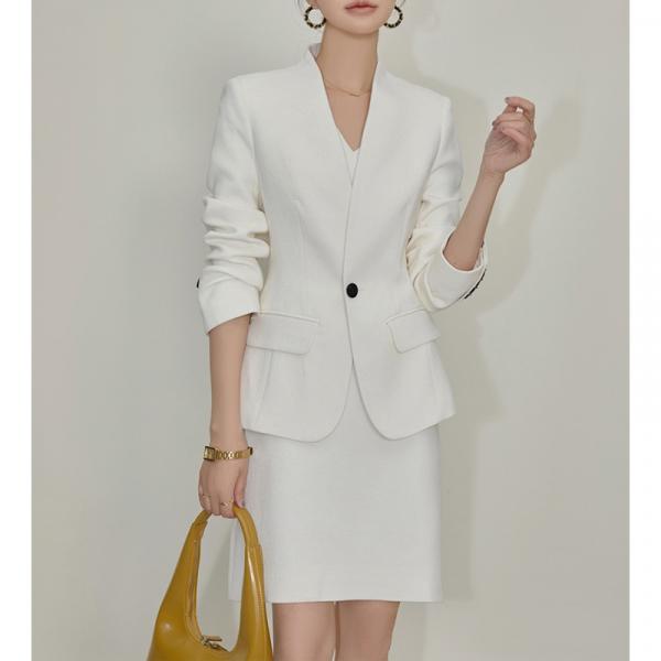 Представляем вашему вниманию модное женское платье-костюм белого цвета, состоящее из обтягивающего блейзера и юбки-карандаш. Этот наряд будет прекрасно подходить как для деловых встреч, так и для повседневного использования.