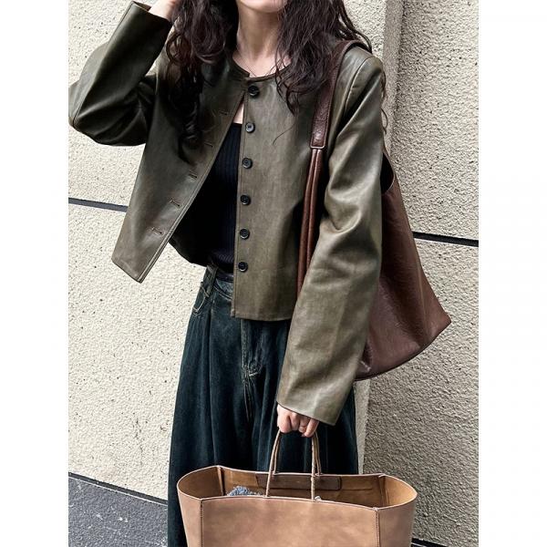 Женская куртка из искусственной кожи с круглым воротником и одним пуговицей оптом из Китая - это стильная и комфортная одежда, которая отлично подойдет для создания модного образа. Куртка изготовлена из высококачественных материалов, идеально подходит для осени. В этой куртке вы будете выглядеть стильно и привлекательно.