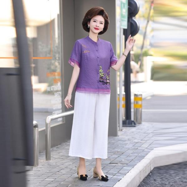 2024春季新款时尚套装妈妈装短袖上衣裤子2件套女装阔腿裤 - это отличный выбор для мам, которые ценят стиль и комфорт. Этот комплект состоит из короткого рукава и брюк, сделанных из качественного материала. Доступные цвета включают в себя фиолетовый, оранжевый и голубой, а также размеры от XL до 5XL.
