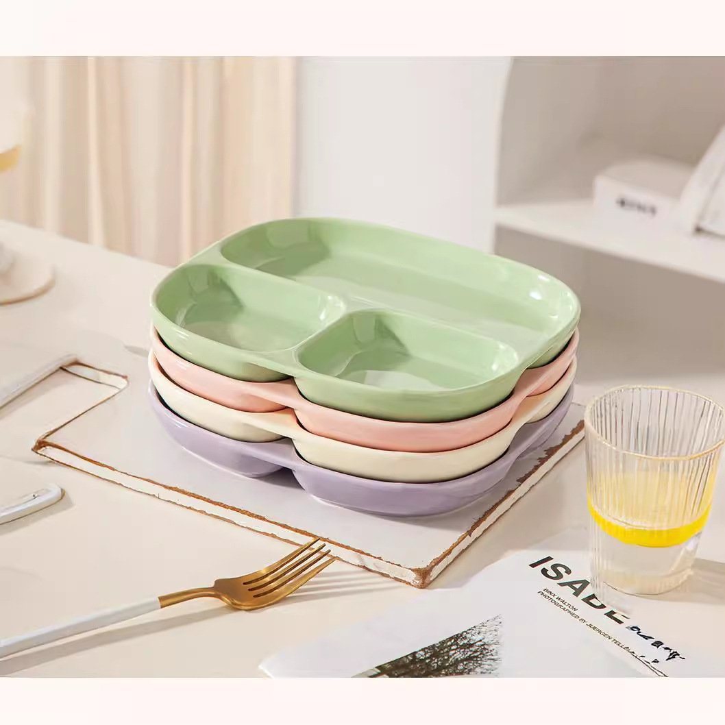 Керамическая тарелка для завтрака с разделением на секции оптом из Китая - это стильная и удобная посуда для сервировки и разделения продуктов. Она идеально подходит для завтраков, обедов или ужинов. Тарелка имеет три разделенных секции, что позволяет разместить различные блюда и убедиться в том, что они не перепутаются.