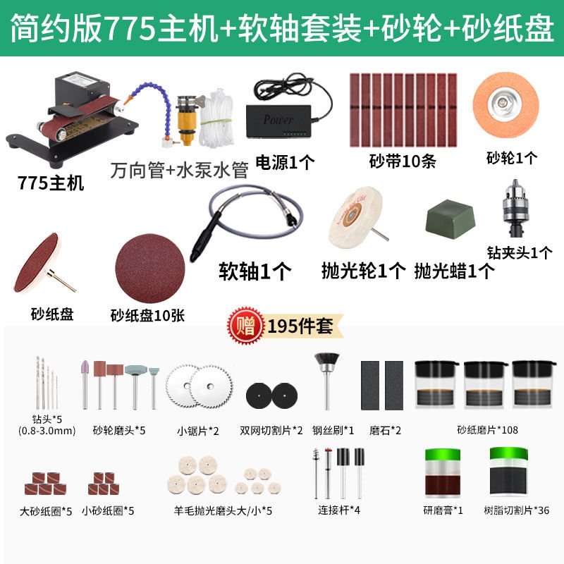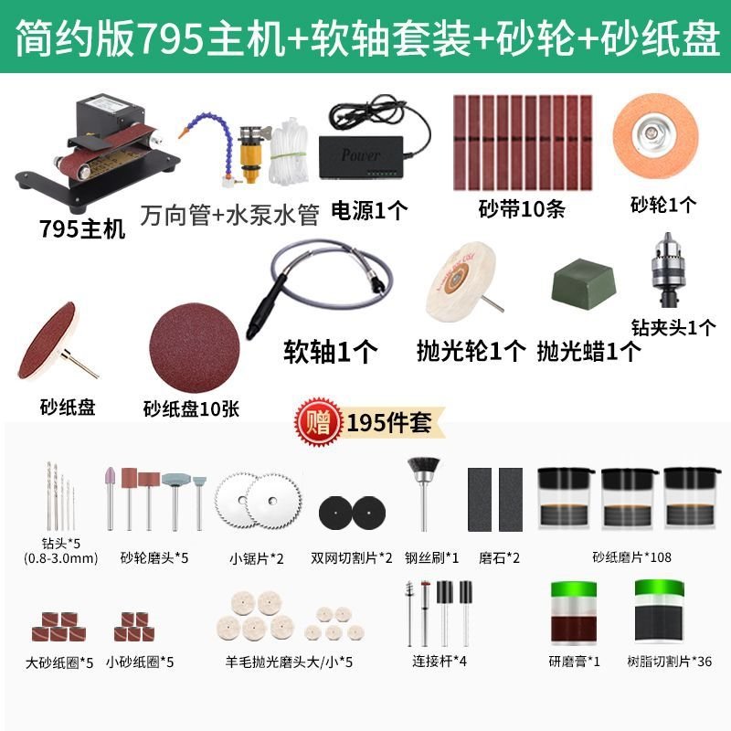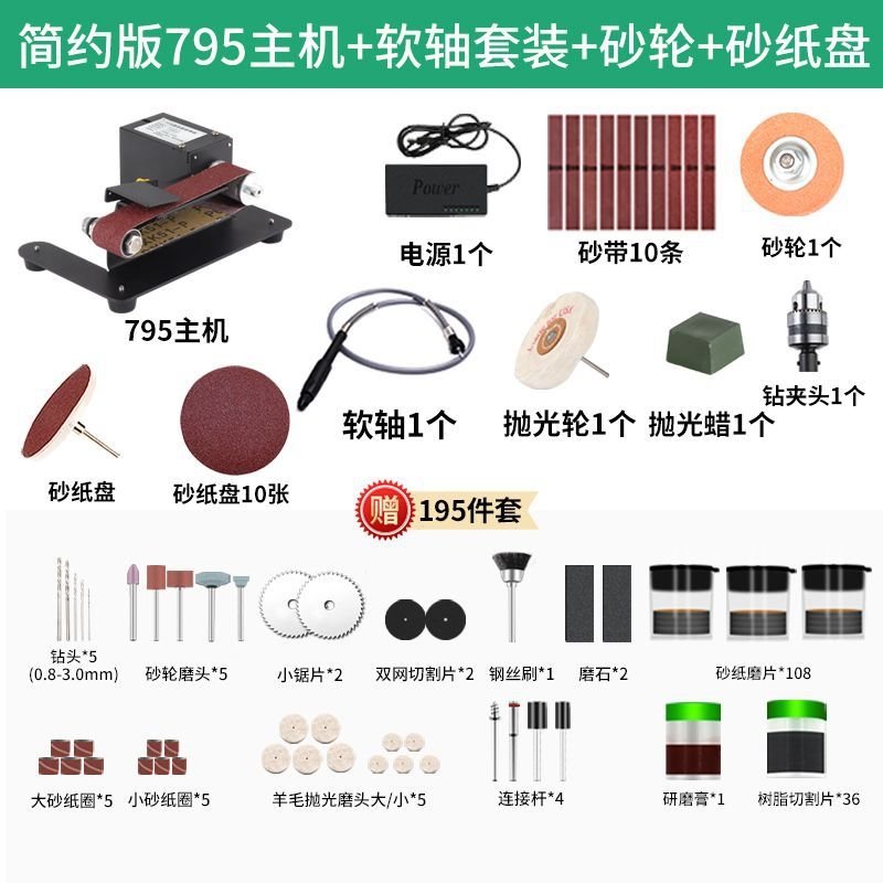 В комплект станка входят следующие принадлежности: 5 штук больших шлифовальных бумаг, 5 штук маленьких шлифовальных бумаг, 5 штук войлочных полировальных головок (больших и маленьких), 4 штанги для крепежа и 36 различных видов наконечников для разнообразных задач.