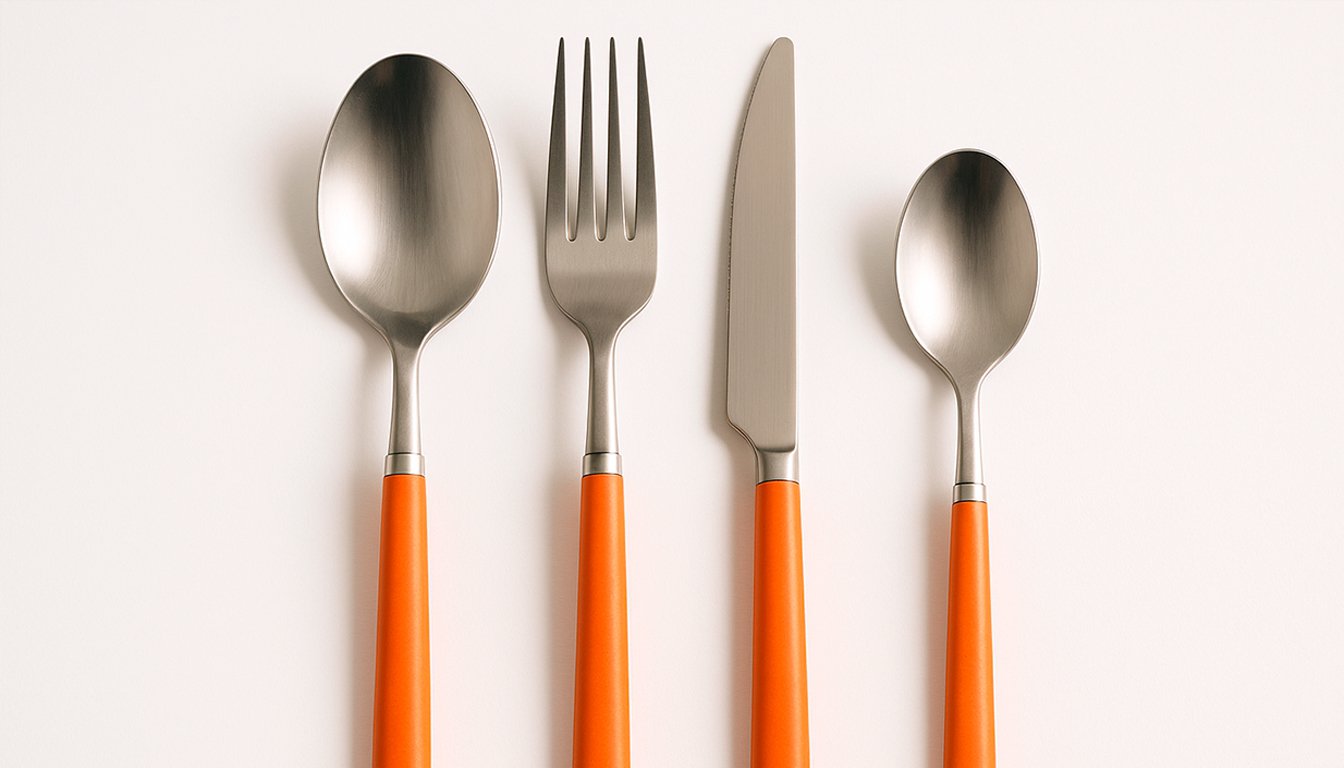 Промт картинки: Реалистичная фотография набора столовых приборов из Китая. Вилка, ложка, нож и чайная ложка из нержавеющей стали аккуратно разложены на белом фоне. Горизонтальная студийная съемка.
